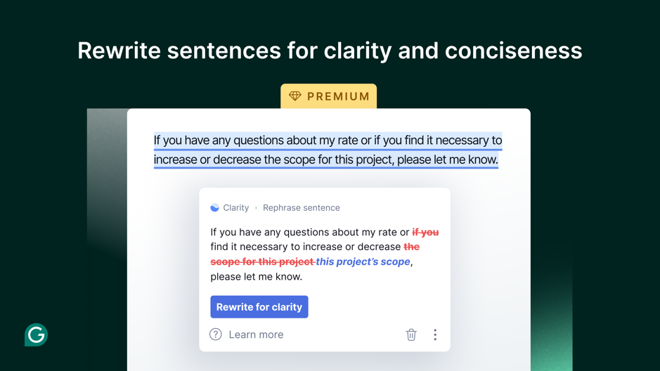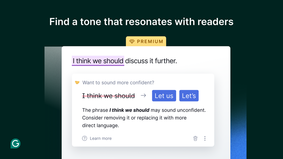 But great writing is about much more than just grammar and spelling. That’s why Grammarly also helps you streamline wordy phrases and rewrite sentences that are likely to confuse readers. It also suggests word choice improvements to help keep readers engaged, and helps you adjust your tone to ensure you come across the way you intend.
